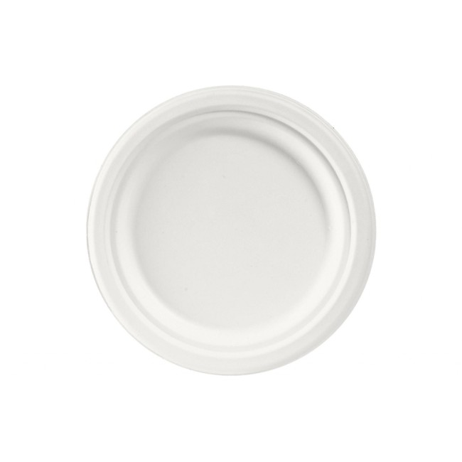 Produkttyp: Einwegteller, Materialtyp: Pflanzliche Faser, Material: Zuckerrohrpulpe (Bagasse), Detailfarbe: Beige, Weiss